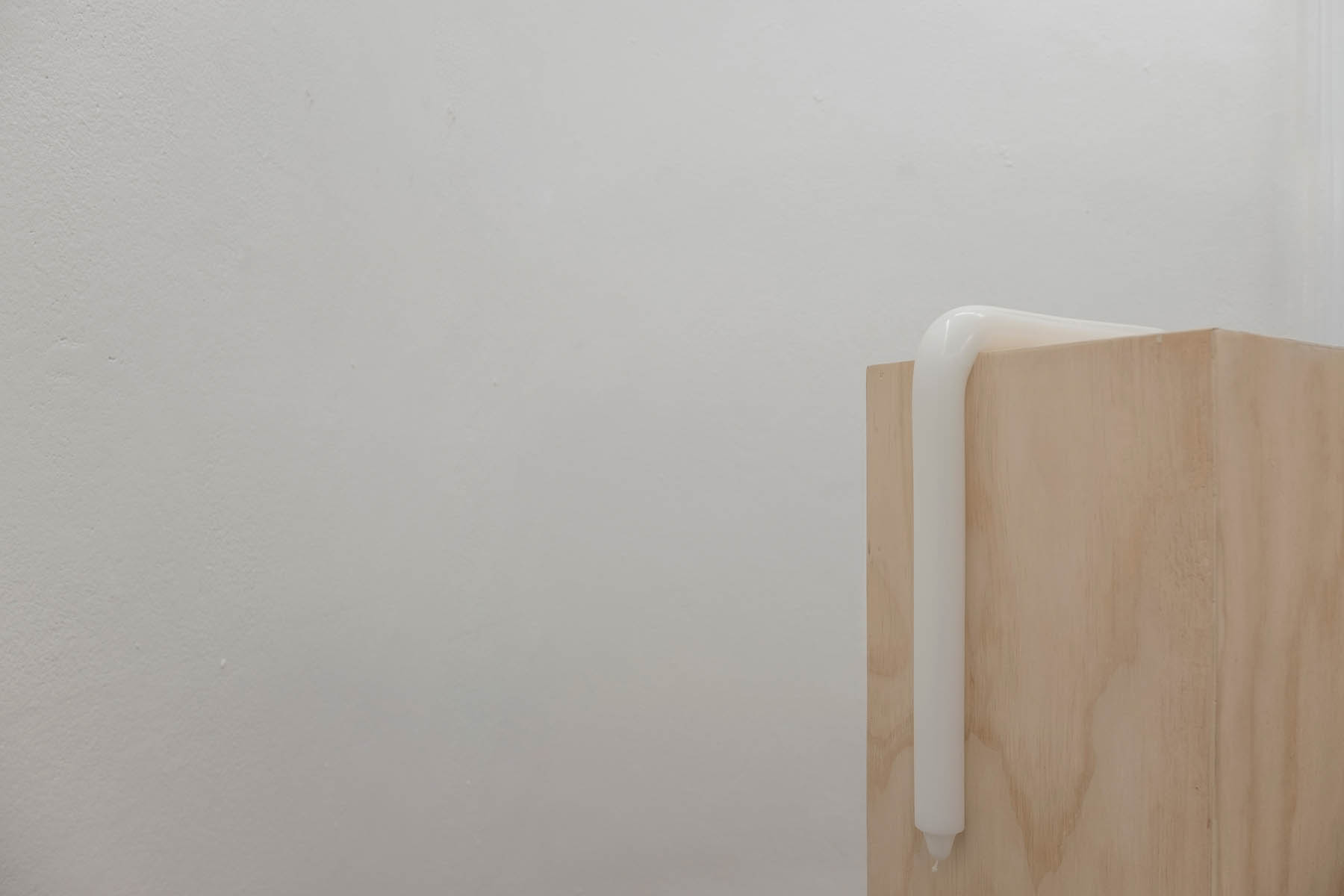The exhibition project brings performance and installation together. A semi-naked young man kneels against the wall motionless. The viewer does not see his face; he remains anonymous. It is not clear whether he is praying or whether it is an act of punishment. A picture of the performance was taken and is used as a separate piece of art. The installation contains wood-en pedestals with seeping candles, similar to those used during the First Communion. The candles adapt and deform in line with the norms dictated by the pedestals as symbols of the power of the Church.