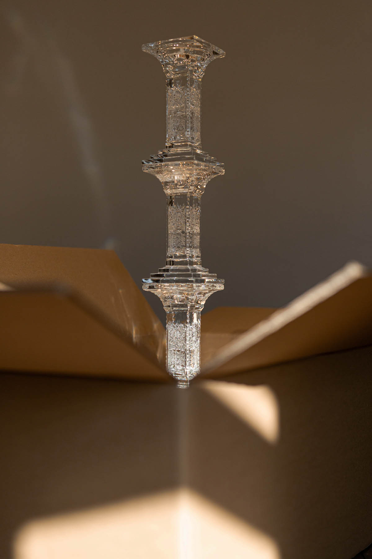 The work consists of certain symbolic totems or small columns made of layered crystal glass candle holders pointing out of cardboard boxes filled with crystal glass fragments. The presented stability of small architecture is built on damaged foundation. Feelings of uncertainty and fragile balance are ever-present, but the objects still stand still despite imperfect conditions.